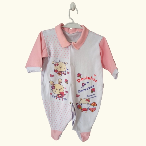 Macacão em algodão rosa com branco, Tamanho P. Com Pezinho